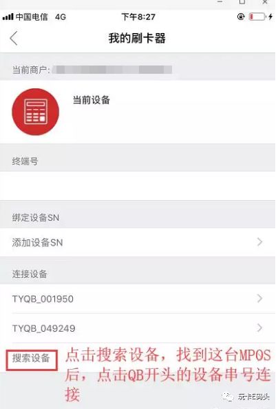 9.进入 我的刷卡器,然后搜索蓝牙,在此打开MPOS,然后搜索蓝牙进行连接。Z5kKAHN1860支付资讯网